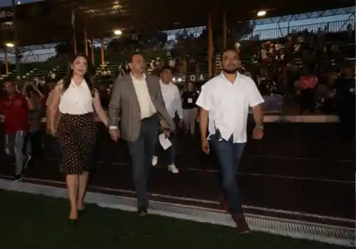 Esta noche, el alcalde, Cruz Pérez Cuéllar, en compañía de su esposa, la presidenta del Desarrollo Integral de la Familia (DIF), Rubí Enríquez, acudieron al evento, Clamor por Juárez, efectuado en el Estadio 20 de Noviembre, ubicado en la calle Ignacio Ramírez, en la colonia, Partido Romero.