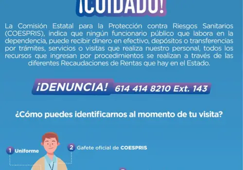 Se han reportado casos de extorsión en el que un grupo de individuos se hacen pasar por verificadores de COESPRIS (Comisión Estatal para la Protección contra Riesgos Sanitarios). Estos sujetos se presentan como personal de la dependencia con el fin de obtener dinero a cambio de “inspecciones” falsas.