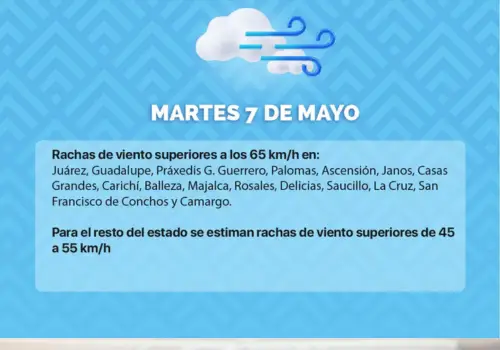 Para el martes 7 de mayo, el cielo estará despejado a parcialmente nublado, y se esperan vientos con velocidades de entre 10 y 20 kilómetros por hora (km/h), con ráfagas que podrían alcanzar los 65 km/h en varias zonas del estado como Juárez, Guadalupe, Práxedis G. Guerrero, Palomas y Ascensión.