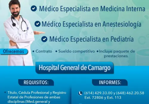 La Secretaría de Salud, a través de la Subdirección de Recursos Humanos, da a conocer las vacantes para ocupar los puestos disponibles en sus diferentes unidades hospitalarias, ubicadas en la capital del estado, Camargo y Juárez, así como en las localidades de Choguita, Cusárare, Parajes y San Ignacio, en la zona serrana.