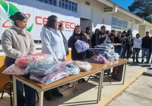 Estudiantes del Colegio de Estudios Científicos y Tecnológicos del Estado de Chihuahua (CECyTECH) plantel El Vergel, en el municipio de Balleza, fueron beneficiados con la entrega de 110 chamarras, como parte de la campaña solidaria “Juntos Sin Frío”, que encabeza el DIF Estatal.