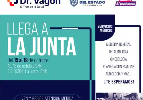 Las atenciones del “Dr. Vagón, el Tren de la Salud”, de Fundación Grupo México, arribarán este 15 de octubre a La Junta, municipio Guerrero, con la finalidad de ofrecer a la ciudadanía, una diversidad de servicios médicos gratuitos.