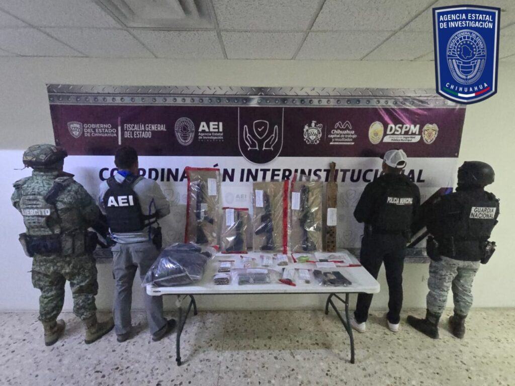 Un total de 266 cartuchos de distintos calibres, cuatro armas largas, cuatro cargadores y una bolsa con aproximadamente un kilo 838 gramos de marihuana fueron asegurados durante un cateo realizado en un domicilio de la colonia Granjas de Sacramento, en la ciudad de Chihuahua.