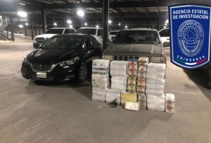 Tras la inspección protocolaria, dentro de una mochila color negro, se le encontraron 45 paquetes multicolor con la leyenda “Muha Meds 100% cannabis, 2000 MG”, y 18 frascos multicolor con la leyenda “MATES Marihuana products”.