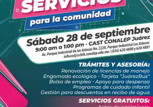 El Colegio de Educación Profesional Técnica del Estado de Chihuahua, (Conalep) invita a la población en general a la Feria de Servicios para la Comunidad, el próximo sábado 28 de septiembre en las instalaciones del Centro de Asistencia y Servicios Tecnológicos (CAST) de Ciudad Juárez.