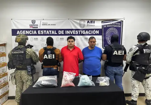 Como resultado del trabajo interinstitucional, elementos de la Agencia Estatal de Investigación, adscritos a la Fiscalía de Distrito Zona Norte, en colaboración con la Secretaría de la Defensa Nacional (DEFENSA), y la Guardia Nacional, capturaron en flagrancia a dos hombres en posesión de diversas drogas en Ciudad Juárez.