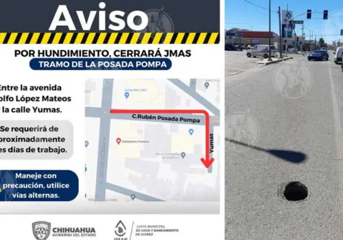 Ciudad Juárez.- Debido a un hundimiento en la calle Rubén Posada Pompa, la Junta Municipal de Agua y Saneamiento (JMAS) procederá al cierre de dicha vialidad, el día de mañana, en el tramo comprendido entre la avenida Adolfo López Mateos y la calle Yumas.