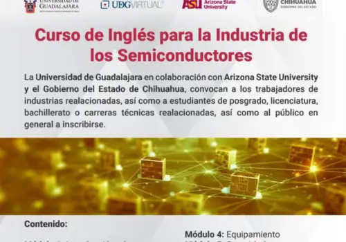El Gobierno del Estado, en colaboración con la Universidad de Guadalajara y la Universidad Estatal de Arizona, invita a registrarse en el “Curso de Inglés para la Industria de Semiconductores”, que se llevará a cabo en la modalidad en línea y de forma gratuita.