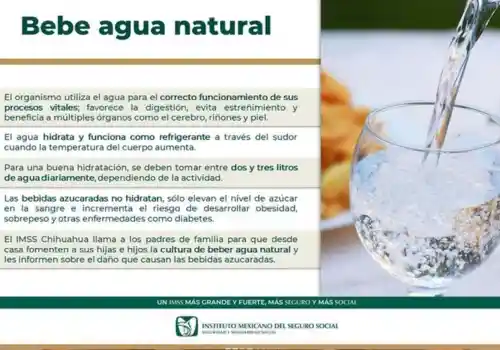 El IMSS Chihuahua llama a las madres y padres de familia para que desde casa fomenten la cultura de beber agua natural y les informen a sus hijas e hijos el daño que causan las bebidas azucaradas en el organismo.