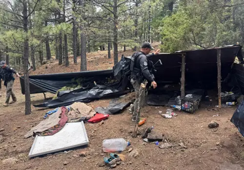 Tras la localización aérea, dos patrullas peatones fueron desplegadas para verificar el sitio, y confirmaron la existencia del campamento habilitado con insumos como alimentos, agua, utensilios de limpieza, cobijas, paneles solares y baterías, cubiertos con una carpa improvisada con hule negro.