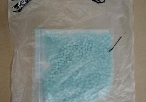 Así como de una bolsa de plástico que contenía en su interior 858 pastillas color azul con las características propias al fentanilo, con un peso total de 94 gramos.