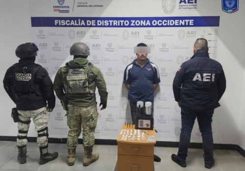 Elementos de la Agencia Estatal de Investigación, detuvieron a un masculino por posesión de cocaína, durante el cateo a la vivienda marcada con el número 5827 de la calle Águilas, entre 58 y 60 de la colonia Miguel Sigala, en la ciudad de Cuauhtémoc.