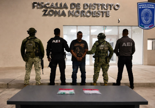 Durante los operativos instrumentados con el apoyo de la Secretaría de la Defensa Nacional en el municipio de Nuevo Casas Grandes, detectaron que dicha persona tenía entre sus pertenencias 12 envoltorios de plástico que contenían una metanfetamina con las características del cristal, así como uno con un polvo blanco similar a la cocaína.