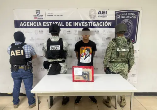 La detención se efectuó en las calles Curazao e Isla Aruba, de la colonia 16 de Septiembre en Ciudad Juárez, en donde los agentes ministeriales le realizaron una revisión encontrándole un arma de fuego tipo pistola, color negro, con un cargador abastecido con siete cartuchos útiles calibre .380