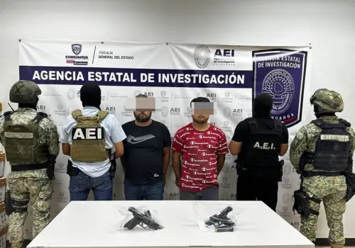 Elementos de la Agencia Estatal de Investigación, adscritos al Centro de Operaciones Estratégicas (COE), de la Fiscalía de Distrito Zona Norte, en coordinación con la Guardia Nacional y el Ejército Mexicano, detuvieron a Héctor Hugo T. G., de 45 años y a Héctor Hugo T. M., por el delito contra la Ley Federal de Armas de Fuego y Explosivos.