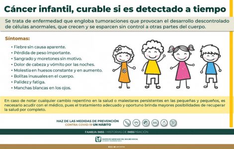 Chihuahua.- El Instituto Mexicano del Seguro Social (IMSS) en Chihuahua, a través de la Jefatura de Servicios Médicos, da a conocer los síntomas del cáncer infantil para una detección y atención oportuna.