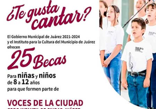 Cd. Juárez.- La Academia Municipal de las Artes (AMA) del Instituto para la Cultura del Municipio de Juárez (IPACULT), está ofreciendo 25 becas para niñas y niños de entre 8 y 12 años de edad, para formar parte del coro Voces de la Ciudad.