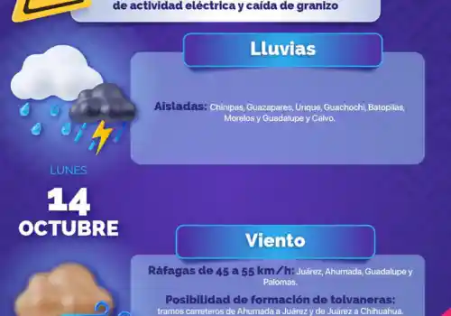 Para la tarde de este lunes 14 de octubre, se prevén vientos con ráfagas que pueden superar los 35 kilómetros por hora (km/h) en Juárez, Guadalupe, Ahumada, Janos, Casas Grandes, Madera, Ignacio Zaragoza, Gómez Farías, Temósachic, Guerrero, Cuauhtémoc, López y Coronado.