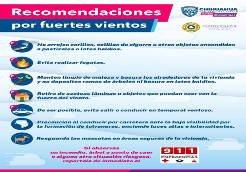 También exhorta a revisar y asegurar techos de lámina, objetos que puedan ser desprendidos fácilmente por el viento, evitar salir a carretera si el clima se torna peligroso, no arrojar cerrillos, colillas de cigarro o realizar fogatas, ya que los vientos pueden propagar de manera rápida el fuego.