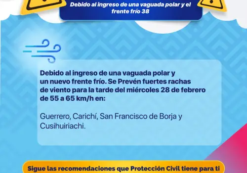En cuanto a los vientos, las rachas oscilarán entre los 55 y 65 kilómetros por hora (km/h) en Guerrero, Carichí, San Francisco de Borja y Cusihuiriachi.