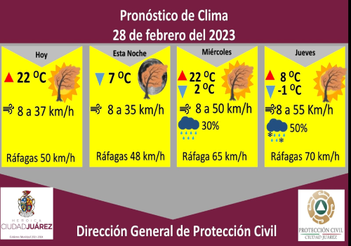 Para hoy se espera una temperatura máxima de 22 °C y mínima de 7 °C, la velocidad del viento se pronostica de 8 a 37 kilómetros por hora durante el transcurso del día.