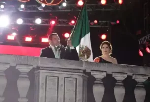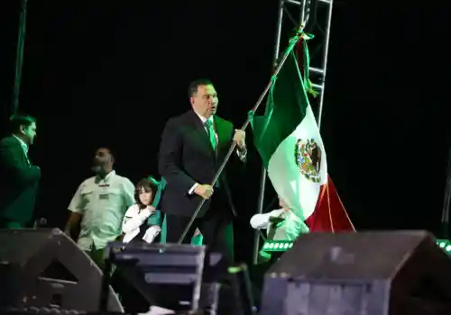 Con motivo de la celebración del 214 aniversario de la Independencia de México, el Presidente Municipal, Cruz Pérez Cuéllar, dio el tradicional grito.
