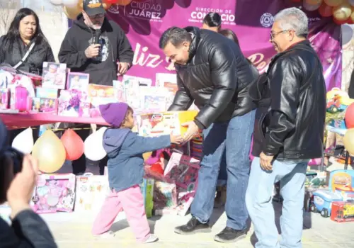 El Presidente Municipal, Cruz Pérez Cuéllar, entregó mil juguetes en el parque Teresa Rojas de la colonia Frida Kahlo, al suroriente de la ciudad.