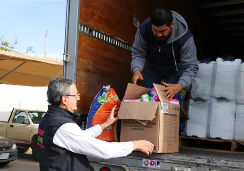 El director general del DIF Estatal, Gabriel Eguiarte Fruns, entregó de 10 toneladas de alimentos, artículos de limpieza y de higiene personal, al coordinador general de la Cruz Roja Delegación Chihuahua, Luis Carlos Aguilera González, para su distribución a las familias que resultaron damnificadas por el paso del huracán “Otis” en el estado de Guerrero.