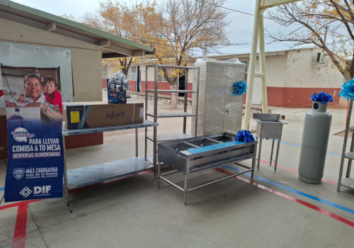 El DIF Estatal entregó equipamientos de comedores y cocinas a cinco escuelas de Cuauhtémoc y dos de Uruachi, para cerrar el año con un total de 45 planteles educativos apoyados en 22 municipios como parte de NutriChihuahua, en beneficio de 4 mil 831 estudiantes.