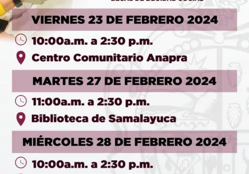 La titular de Educación indicó que el 23 de febrero se hará entrega de referencias bancarias en el Centro Comunitario Anapra, en horario de 10:00 de la mañana a 2:30 de la tarde. El 27 de febrero serán las entregas en la biblioteca de Samalayuca, a partir de las 11:00 a.m y hasta las 2:30 p.m, mientras que el 28 de febrero serán en la Secundaria Técnica 93, de 10:00 a 14:30 horas.