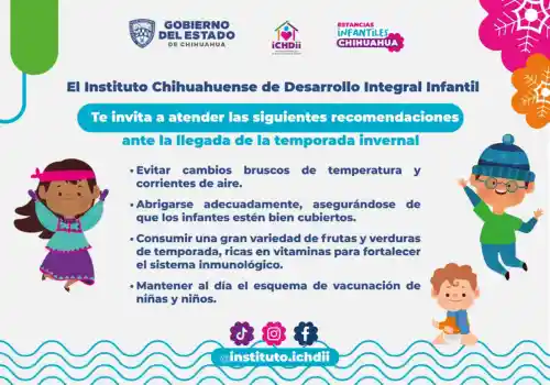 Ante la llegada de la temporada invernal, el Instituto Chihuahuense de Desarrollo Integral Infantil (Ichdii) exhorta a las familias de la entidad, a extremar precauciones para proteger la salud de las niñas y niños, especialmente de los menores de 5 años de edad.