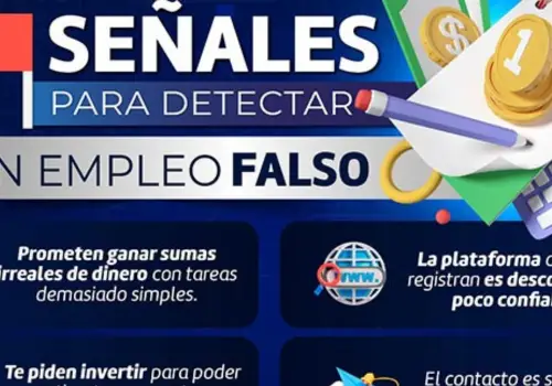 La corporación exhorta a la población a desconfiar de este tipo de ofertas laborales y verificar siempre la legitimidad de las empresas antes de compartir información personal o realizar depósitos de dinero.