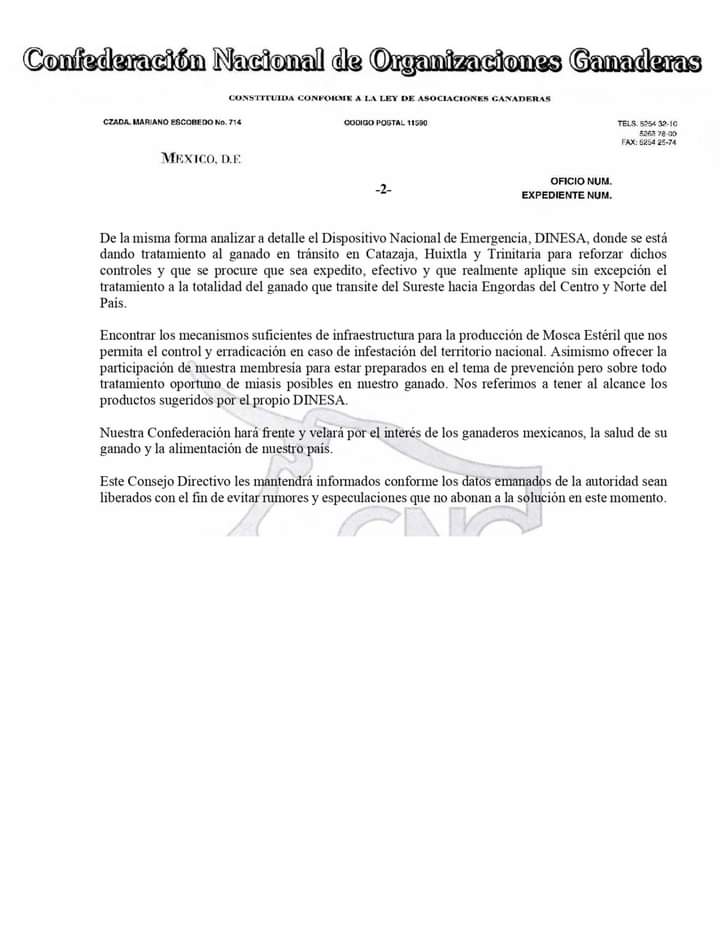 “Por ello, que ante la amenaza de entrada a México del Gusano Barrenador de Ganado, GBG, en nuestra Convención Semianual el 7 de noviembre, pedimos públicamente a la Administración Federal el cierre inmediato de la Frontera Sur, con el fin de combatir y evitar el contrabando de ganado centroamericano”.