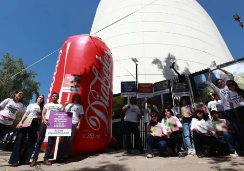 Además, los manifestantes llegaron con una lata gigante alusiva a las de la refresquera Coca Cola, pero con la leyenda “los edulcorantes también hacen daño”.