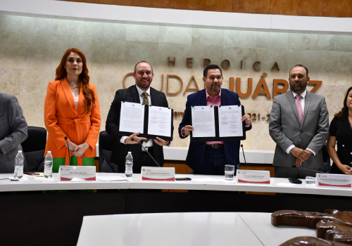 El encargado del despacho de la Secretaría de Salud, Gilberto Baeza Mendoza y el alcalde de Juárez, Cruz Pérez Cuéllar, formalizaron la transferencia del Centro Antirrábico mediante la firma del convenio de colaboración y concertación de acciones, para lograr que su operación y funcionamiento sean coordinados por la autoridad municipal.