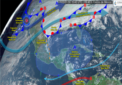 Hoy, el Frente Frío Número 28 sobre el noreste de México, la corriente en chorro subtropical, un canal de baja presión en el Golfo de México y la Quinta Tormenta Invernal que se encuentra sobre Sonora ocasionarán lluvias muy fuertes (de 50 a 75 milímetros [mm]) en Chihuahua y Durango; fuertes (de 25 a 50 mm) en Baja California Sur, Coahuila y Sinaloa; chubascos (de 5 a 25 mm) en Baja California, Nuevo León, Tamaulipas y Sonora, y lluvias aisladas (de 0.1 a 5 mm) en San Luis Potosí y Zacatecas.