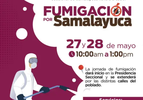 Como parte de los trabajos coordinados con las diferentes dependencias del Gobierno Municipal, mañana martes 27 y miércoles 28 de mayo se llevará a cabo el programa Fumigación por Samalayuca, dio a conocer el Presidente Seccional, Gerardo Esparza Meléndez.