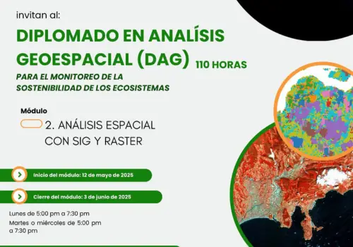 La modalidad es virtual, con sesiones sincrónicas en línea, complementadas con actividades prácticas que pueden desarrollarse desde casa, lo que facilita el acceso a una formación metodológicamente sólida sin restricciones geográficas. Este módulo está diseñado para quienes desean integrar el análisis geoespacial en su quehacer profesional o académico, en un entorno de acompañamiento académico y actualización continua.