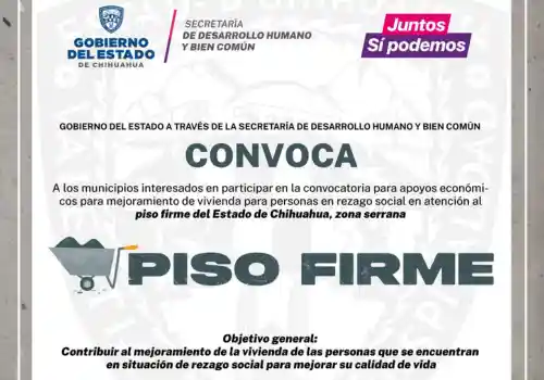La Secretaría de Desarrollo Humano y Bien Común (SDHyBC) convoca a autoridades de los municipios ubicados en la Sierra Tarahumara, a participar en la convocatoria “Piso Firme”, que consiste en la entrega de apoyos económicos para mejoramiento de viviendas.