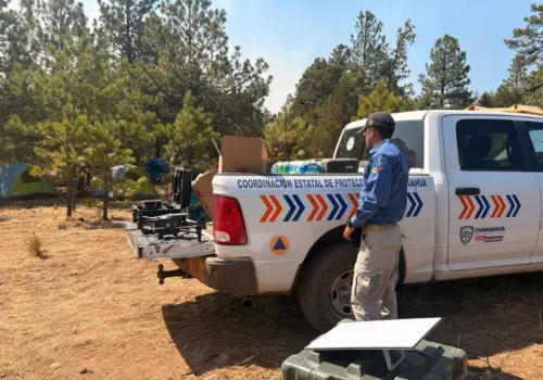 Personal de la Coordinación Estatal de Protección Civil (CEPC), llevó a combatientes incendios forestales que trabajan en el municipio de Madera, equipo de comunicación satelital y suministros esenciales, en apoyo a su labor.