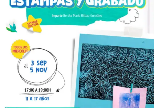 Para preadolescentes y adolescentes de 11 a 17 años, todos los miércoles desde el 3 de septiembre, se contará con atención en el taller de Estampas y Grabado, donde podrán dar vida a sus ideas y emociones a través de la imagen, en un horario de 17:00 a 19:00 horas.