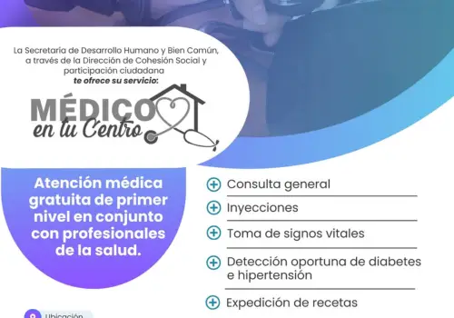 La Secretaría de Desarrollo Humano y Bien Común (SDHyBC), a través de la Dirección de Cohesión Social y Participación Ciudadana, ofrece al público en general los servicios del programa “Médico en tu Centro”, a cargo de profesionales de la salud.