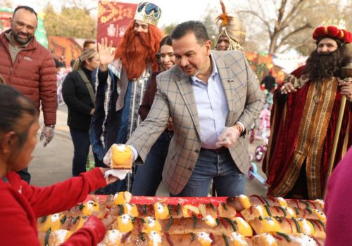 Cientos de familias juarenses acudieron esta tarde al parque DIF, situado en la avenida Heroico Colegio Militar, para partir la rosca gigante de 300 metros por el Día de los Reyes Magos.