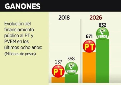 El PT pasó de recibir 236.8 millones de pesos en 2018 a 670.6 millones en 2026, un aumento de 183 por ciento. Mientras que el PVEM incrementó su financiamiento de 368 millones a 832.1 millones de pesos, un alza de 126 por ciento.