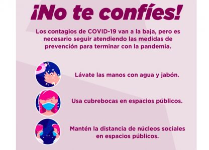 Cd. Juárez.- La Dirección de Salud del Gobierno Municipal pidió a la comunidad fronteriza seguir atendiendo las medidas correspondientes para la prevención del Coronavirus COVID-19, pues aun que el índice de contagios se mantiene a la baja, aún es necesario protegernos para salir de la pandemia.