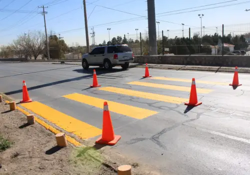 Personal del área de Control de Tráfico de la Coordinación General de Seguridad Vial, pintó los pasos peatonales frente al lugar conocido como El Punto, donde se encuentra el centro de atención a migrantes construido por el Gobierno Federal.
