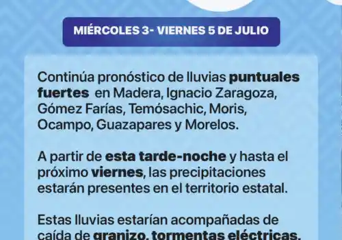 La Coordinación Estatal de Protección Civil (CEPC), informó que para la tarde de este miércoles 3 y durante el jueves 4 de julio, se pronostica presencia de lluvias de fuertes a puntuales en el estado, principalmente en municipios de la Sierra Tarahumara.