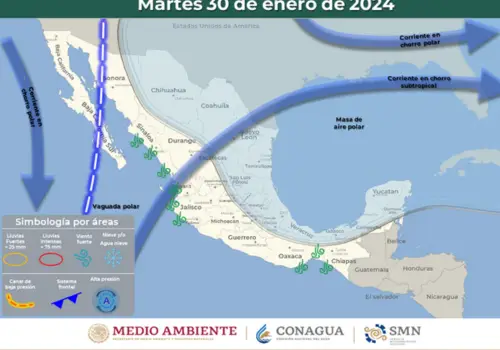 Cabe señalar que, durante el miércoles es menor la posibilidad de caída de aguanieve y nieve en las partes altas de la sierra, y para las partes de la región semidesértica se cuenta con la posibilidad de caída de granizo y actividad eléctrica.