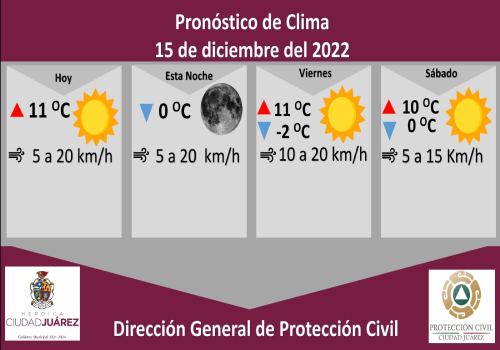 La Dirección General de Protección Civil, con base en informes del Servicio Meteorológico Nacional, pronostica una temperatura mínima de 0 °C para la noche de este jueves, en tanto que la máxima será de 11°C, informó Roberto Briones Mota titular de la dependencia.