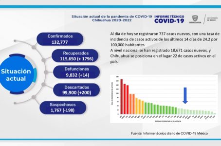 A nivel nacional se registraron 18 mil 671 casos nuevos y el estado de Chihuahua se posiciona en el lugar 22 de casos activos en el país, de forma que posee una tasa de incidencia de casos activos de los últimos 14 días de 24.2 por cada 100 mil habitantes.